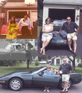 "And many a joke had he." In over thirty years since the original photos at left were taken, there have been many changes. Hair and clothing styles differ, the landscape has grown up, and the basketball hoop has been traded for a set of motion detector lights. The one thing that has remained the same is Art Milano's love for Corvettes. In the photo collage, Art is shown with sister Freddie and his red Vette (top left) and directly beneath in the black and white photo with sister Barbara. Both photos were recently recreated in the same place with the same people. The only difference is the color and year of the Corvette. |